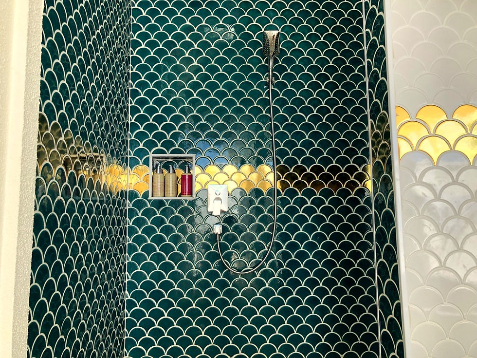 Вся ванная комната отделана золотой кафельной плиткой, которая ослепительно сияет в лучах солнца, заглядывающих в широкие проемы между стенами и потолком. Во всех ванных комнатах Beach Suite with Pool - наборы принадлежностей в особых косметичках. Синяя - для мужчин, розовая - для женщин. Одноразовые станки, зубные щетки с пастами, палочки и ватные диски.
